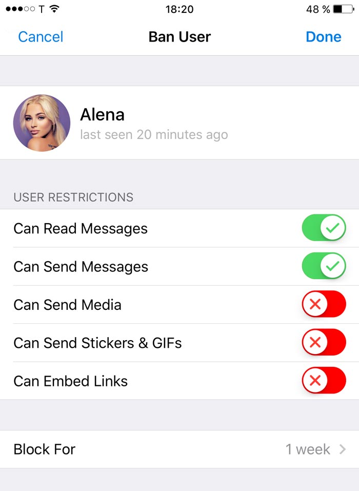 Admins who don’t want to completely ban members from their supergroups can now partially restrict their rights in order to stop behavior that's causing problems. You can put nasty users into read-only mode or maybe stop them from sending stickers or media for a certain period of time. Now you can do all of this with absolute precision: