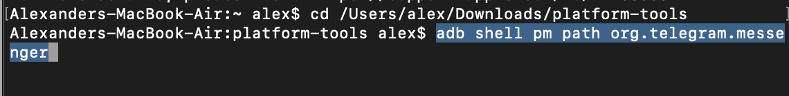 The output will look something like this:package:/data/app/org.telegram.messenger-_zOSURFEx2GpHM8UDF_PVg==/base.apk