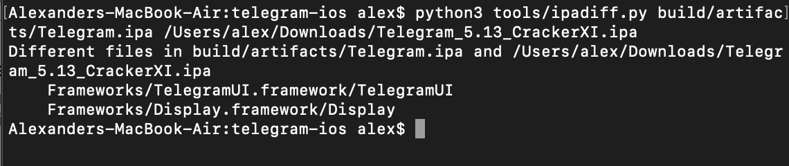 Runpython3 tools/ipadiff.py build/artifacts/Telegram.ipa PATH-TO-THE-IPA-FILE-FROM-STEP-9