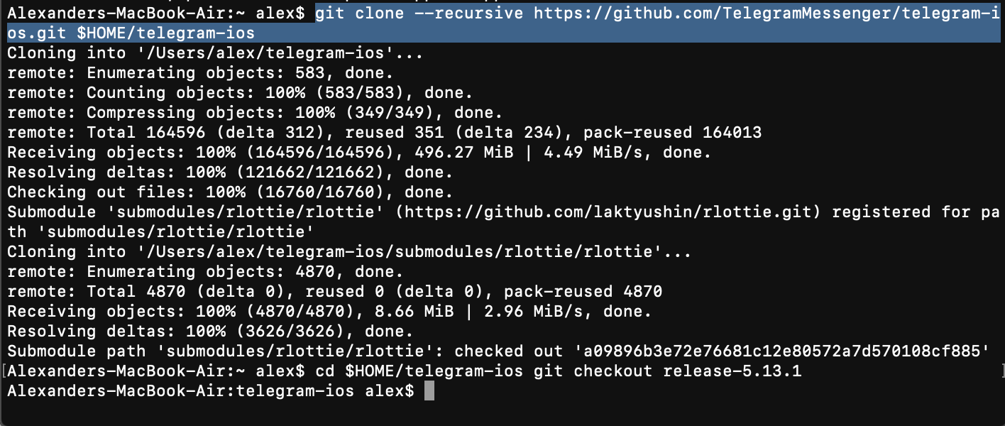 git clone --recursive https://github.com/TelegramMessenger/telegram-ios.git $HOME/telegram-ioscd $HOME/telegram-iosgit checkout release-${VERSION_NUMBER}
